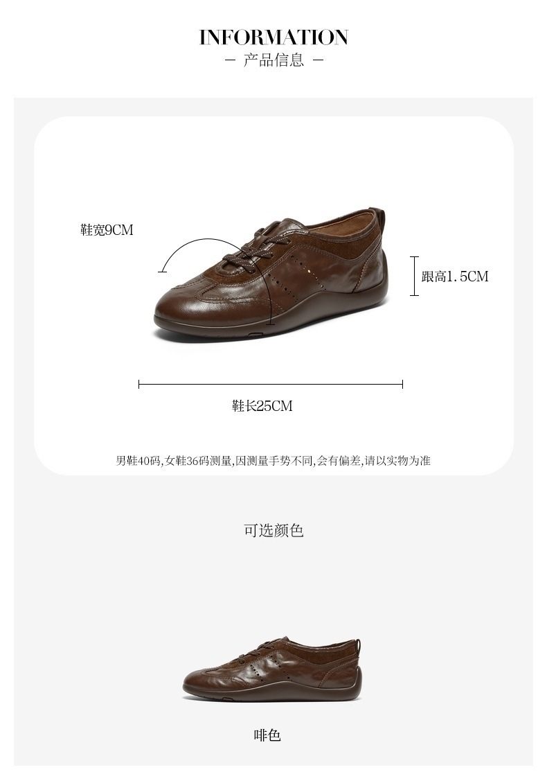 | 鞋帮:低帮 | 鞋底材质:橡胶底 | 内增高:无 | 鞋面材质:牛剖层革羊皮革 | 闭合方式:系带 |