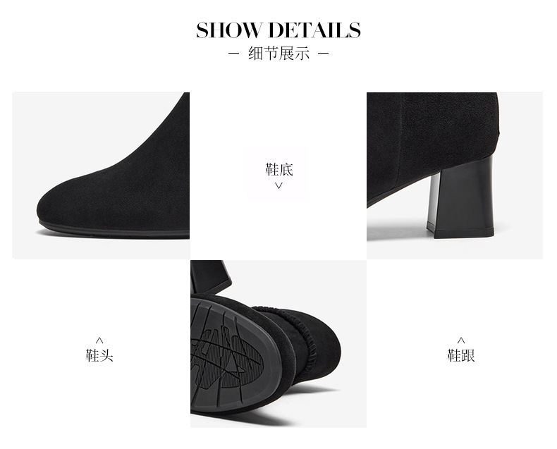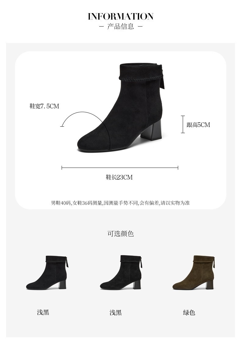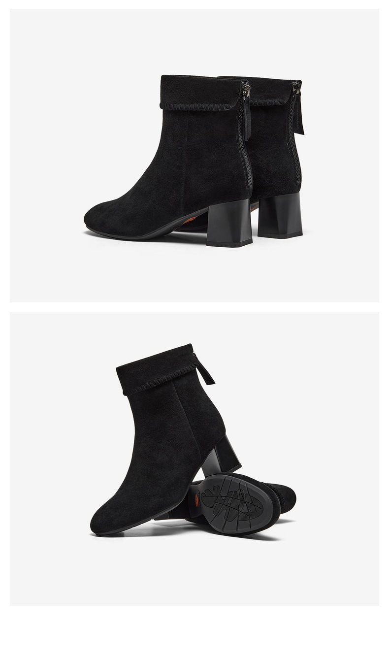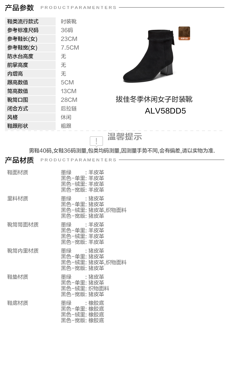 | 鞋底材质:橡胶底 | 靴筒内里材质:猪皮革织物面料 | 内增高:无 | 鞋面材质:羊皮革 | 闭合方式:后拉链 |