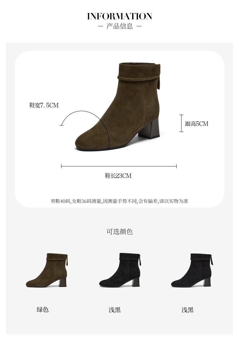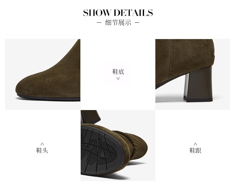 | 鞋底材质:橡胶底 | 靴筒内里材质:猪皮革 | 内增高:无 | 鞋面材质:羊皮革 | 闭合方式:后拉链 |
