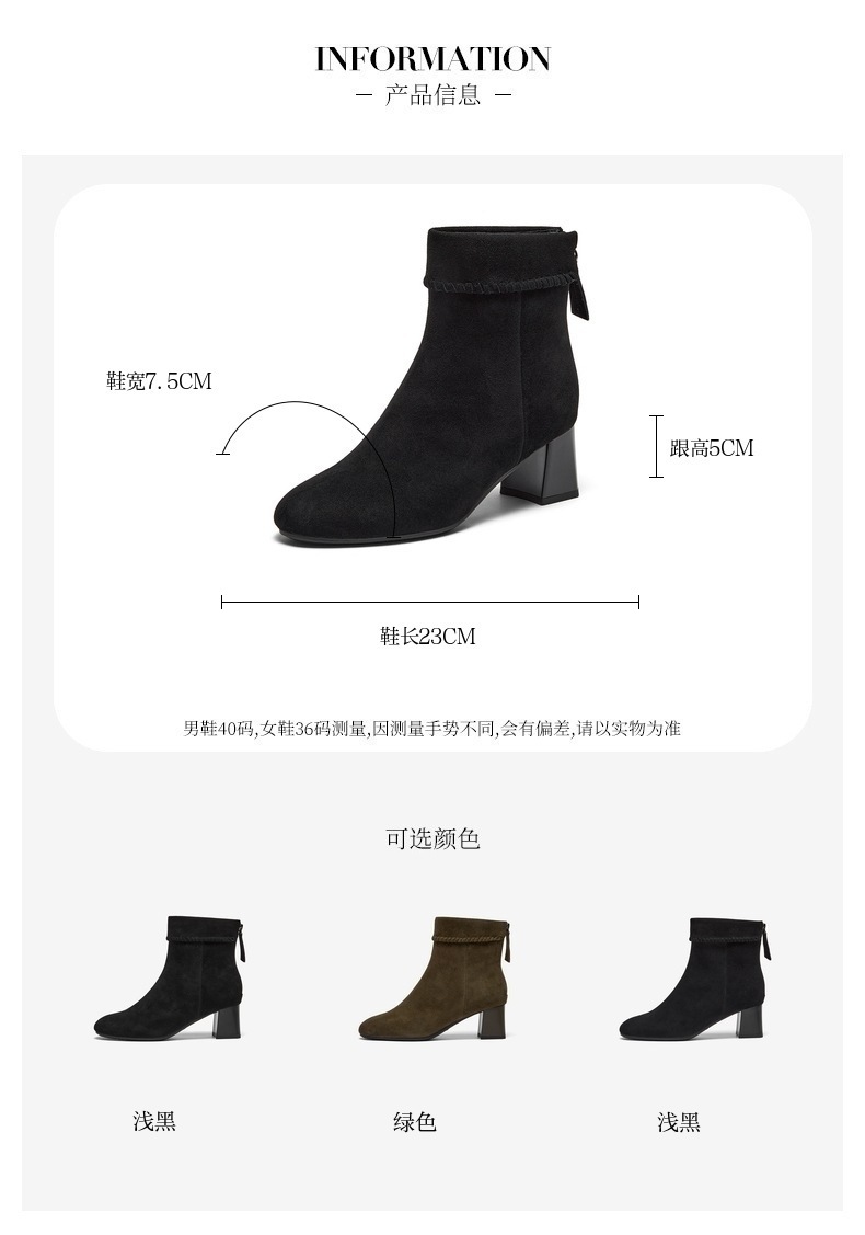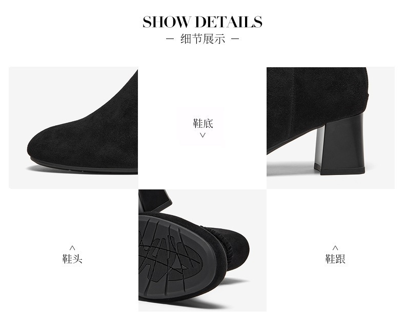 | 鞋底材质:橡胶底 | 靴筒内里材质:猪皮革 | 内增高:无 | 鞋面材质:羊皮革 | 闭合方式:后拉链 |