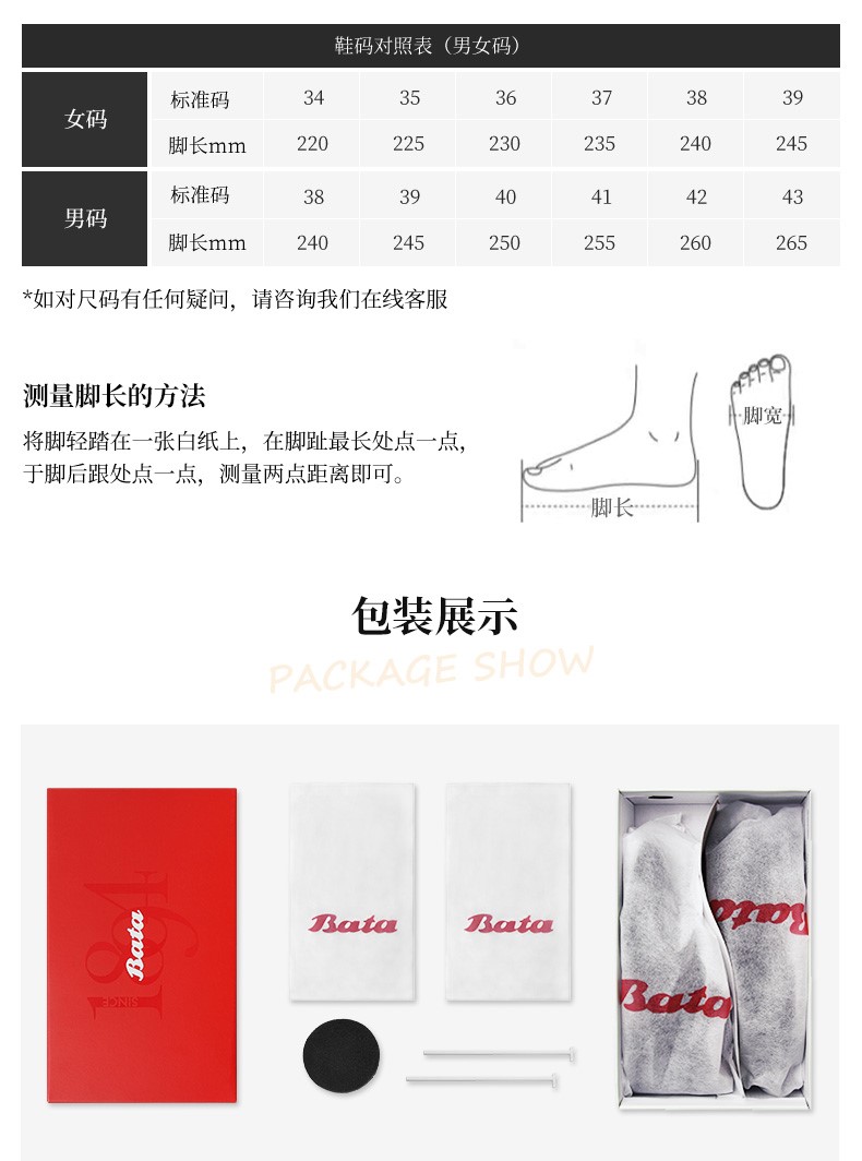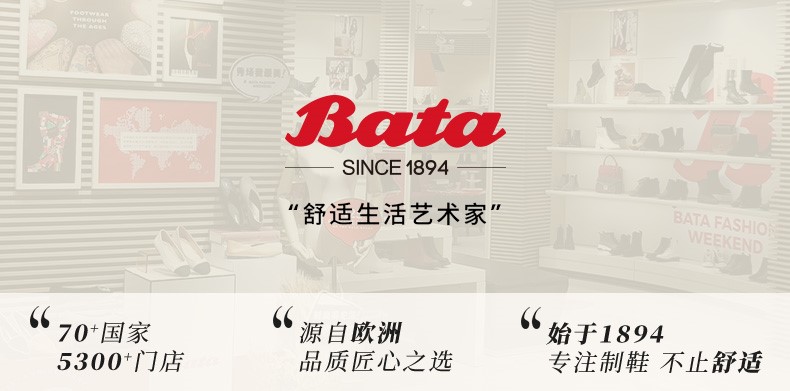 Bata(拔佳),品牌起源于1894年,在捷克的一间手工作坊诞生。品牌理念“我们专注制鞋”,120多年以来,Bata始终秉承百年传统制鞋技术与工艺,致力于为顾客提供舒适的鞋履。