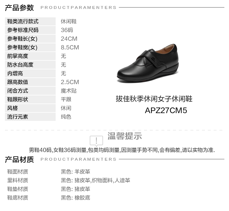 | 鞋帮:低帮 | 鞋底材质:橡胶底 | 内增高:无 | 鞋面材质:羊皮革 | 闭合方式:魔术贴 |
