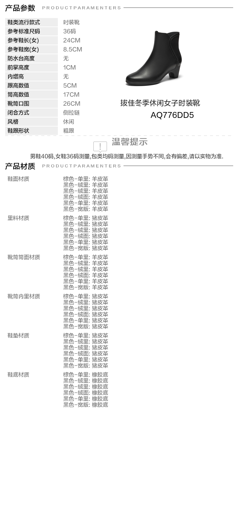 参考鞋宽(女):8.5CM 风格:休闲 色系:黑色 跟高数值:5CM 筒高数值:17CM