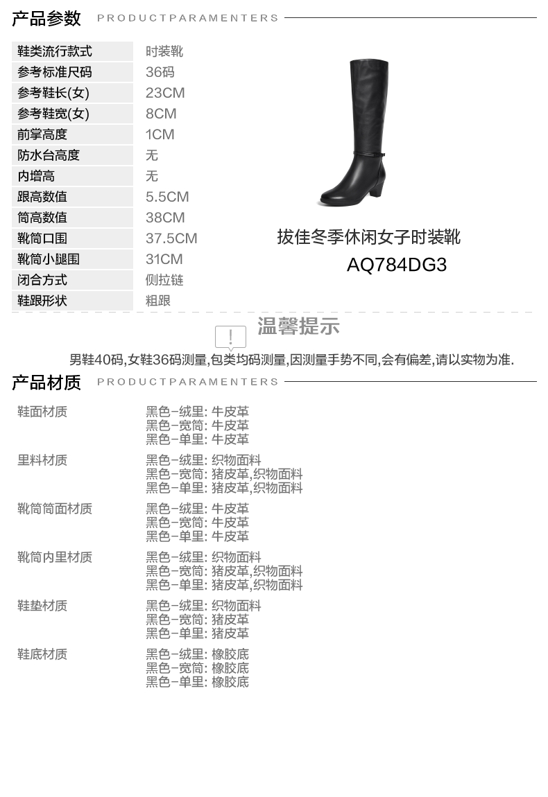 | 靴筒筒面材质:牛皮革 | 靴筒小腿围:31CM | 里料材质:猪皮革 | 制鞋工艺:胶贴皮鞋 | 款式季节:冬季 |
