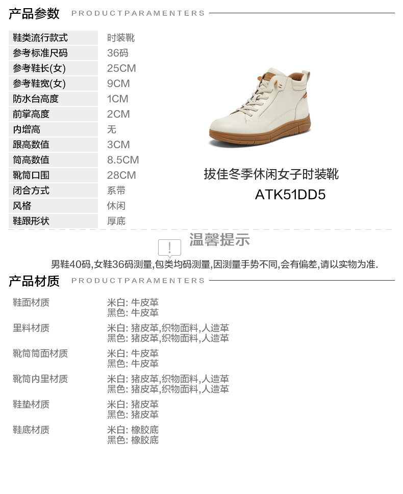 | 筒高数值:8.5CM | 性别:女子 | 靴筒筒面材质:牛皮革 | 里料材质:人造革织物面料猪皮革 | 制鞋工艺:胶贴皮鞋 |