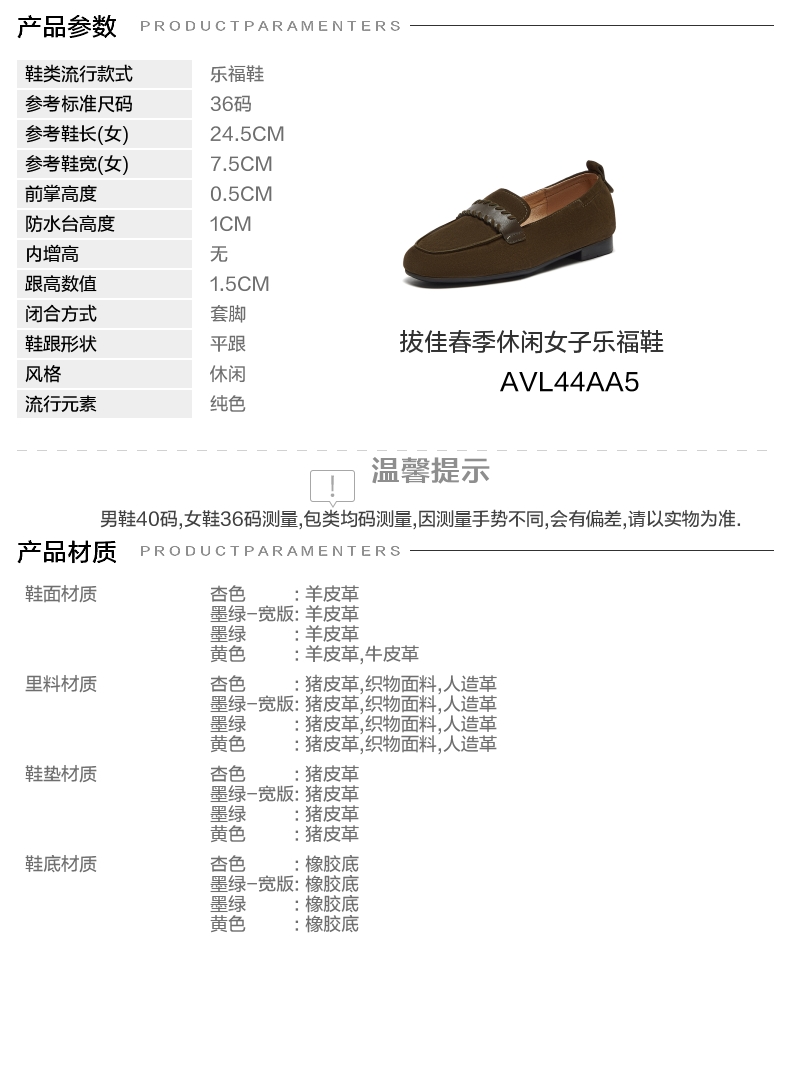 | 上市时间:2025年春季 | 鞋类流行款式:乐福鞋 | 鞋头款式:圆头 | 跟高范围:低跟鞋(小于3CM) | 鞋面图案:纯色 |