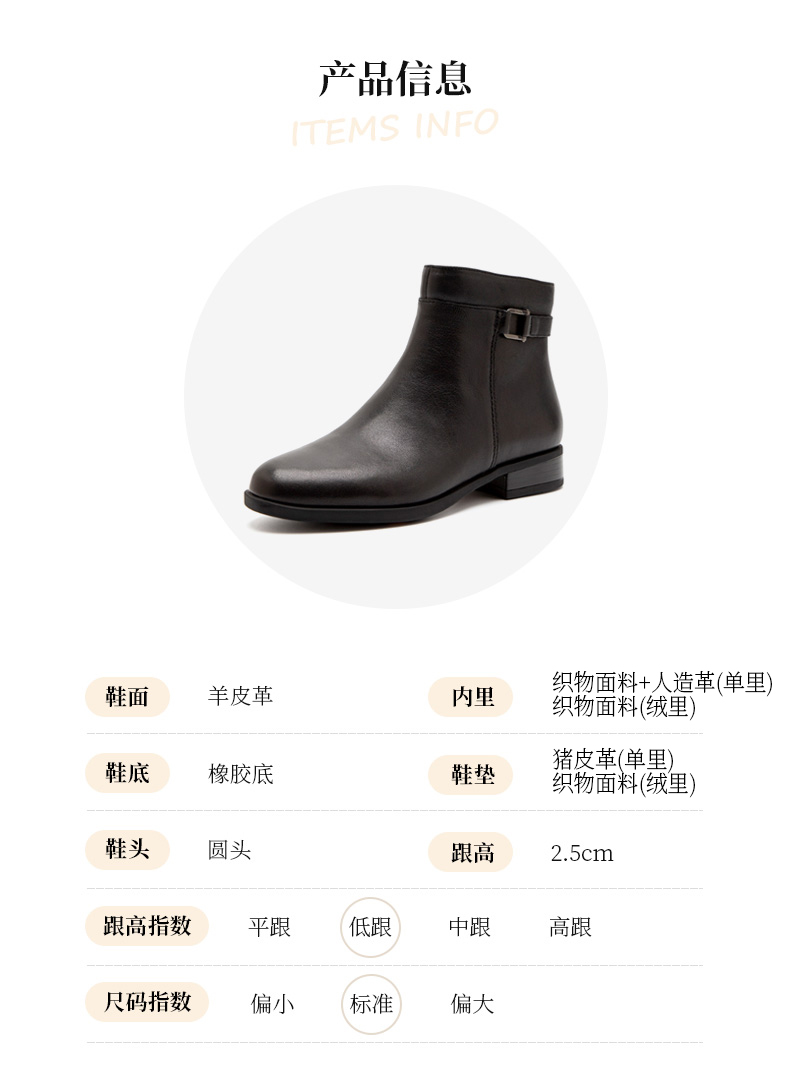 | 鞋底材质:橡胶底 | 靴筒内里材质:人造革织物面料 | 内增高:无 | 鞋面材质:羊皮革 | 闭合方式:侧拉链 |