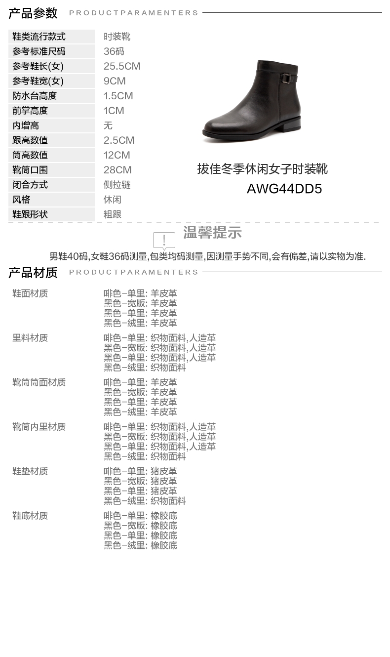 | 参考鞋宽(女):9CM | 风格:休闲 | 色系:黑色 | 跟高数值:2.5CM | 筒高数值:12CM |