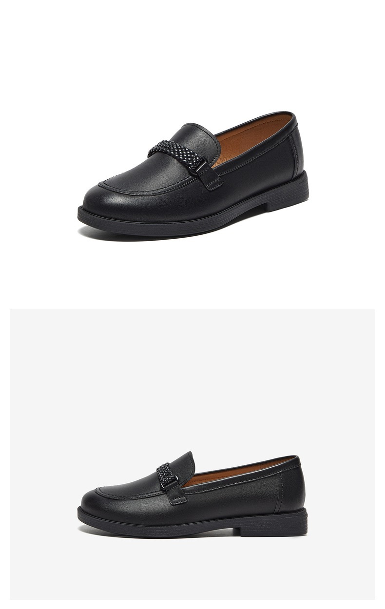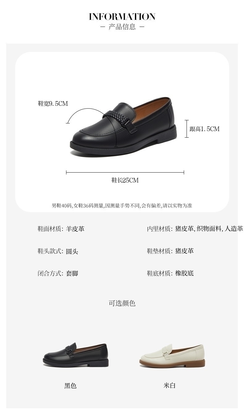 | 鞋类流行款式:乐福鞋 | 鞋头款式:圆头 | 跟高范围:低跟鞋(小于3CM) | 鞋面图案:纯色 | 鞋跟形状:平跟 |