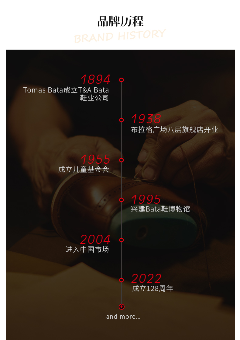 Bata(拔佳),品牌起源于1894年,在捷克的一间手工作坊诞生。品牌理念“我们专注制鞋”,120多年以来,Bata始终秉承百年传统制鞋技术与工艺,致力于为顾客提供舒适的鞋履。