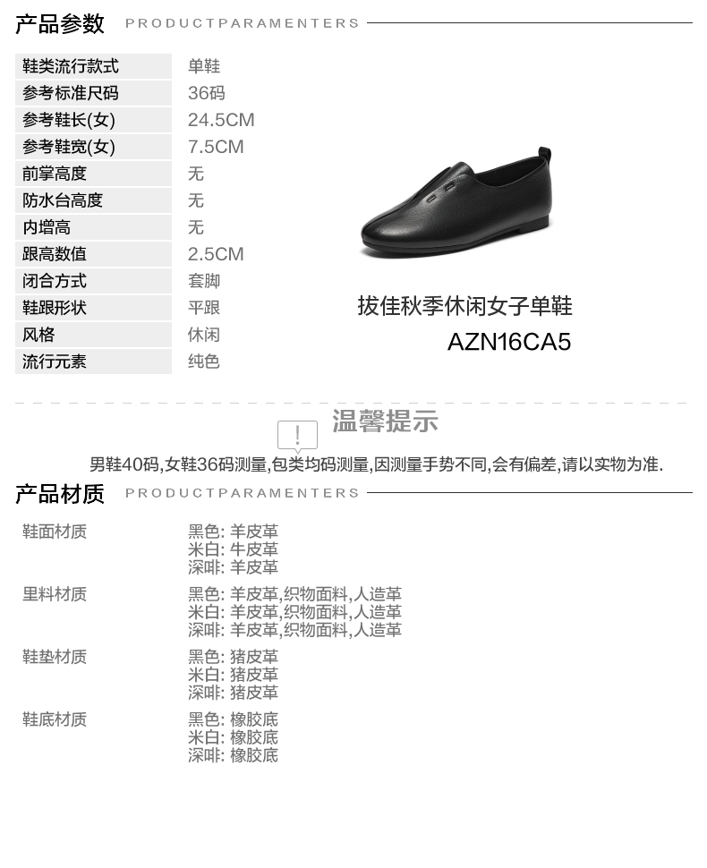 | 鞋帮:低帮 | 鞋底材质:橡胶底 | 内增高:无 | 鞋面材质:羊皮革 | 闭合方式:套脚 |