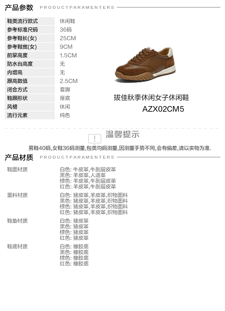 | 色系:棕色 | 跟高数值:2.5CM | 性别:女子 | 里料材质:织物面料羊皮革猪皮革 | 制鞋工艺:胶贴皮鞋 |