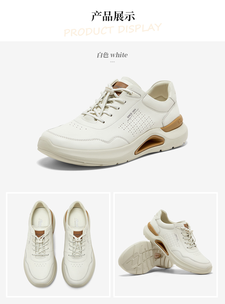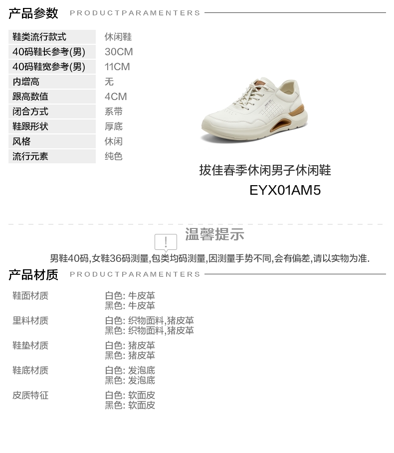 | 色系:白色 | 跟高数值:4CM | 性别:男子 | 里料材质:猪皮革织物面料 | 制鞋工艺:胶贴皮鞋 |