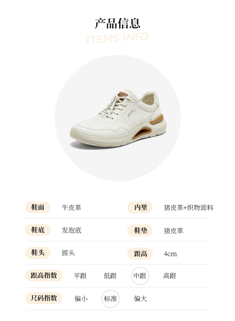 | 色系:白色 | 跟高数值:4CM | 性别:男子 | 里料材质:猪皮革织物面料 | 制鞋工艺:胶贴皮鞋 |