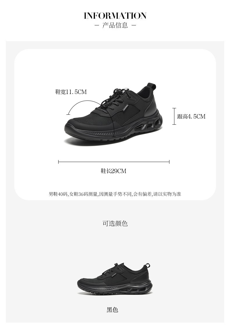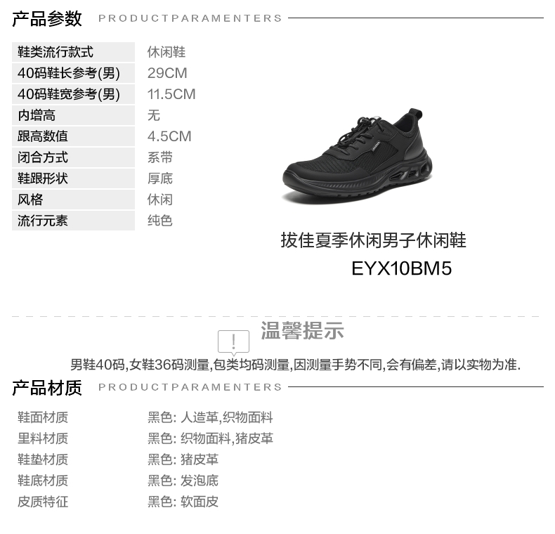 | 风格:休闲 | 色系:黑色 | 跟高数值:4.5CM | 40码鞋宽参考(男):11.5CM | 性别:男子 |