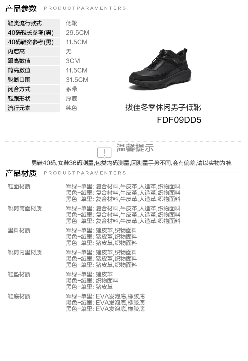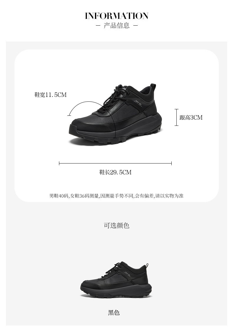 | 闭合方式:系带 | 40码鞋宽参考(男):11.5CM | 靴筒口围:31.5CM | 上市时间:2025年冬季 | 鞋类流行款式:低靴 |