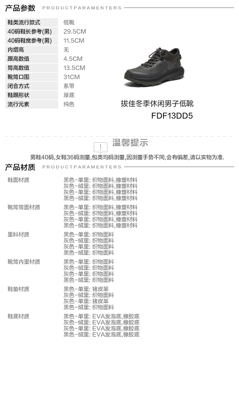 | 闭合方式:系带 | 40码鞋宽参考(男):11.5CM | 靴筒口围:31CM | 上市时间:2025年冬季 | 鞋类流行款式:低靴 |