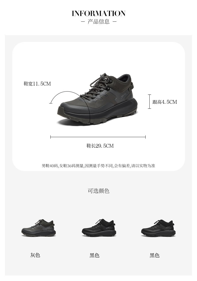 | 闭合方式:系带 | 40码鞋宽参考(男):11.5CM | 靴筒口围:31CM | 上市时间:2025年冬季 | 鞋类流行款式:低靴 |
