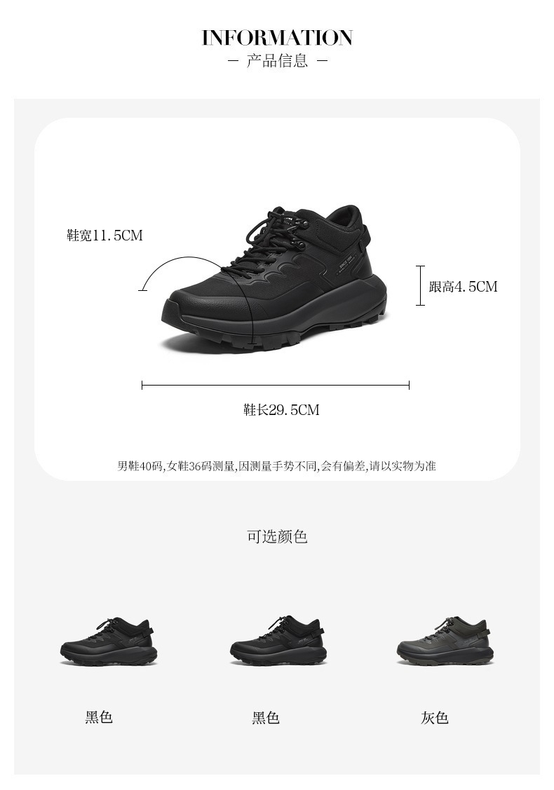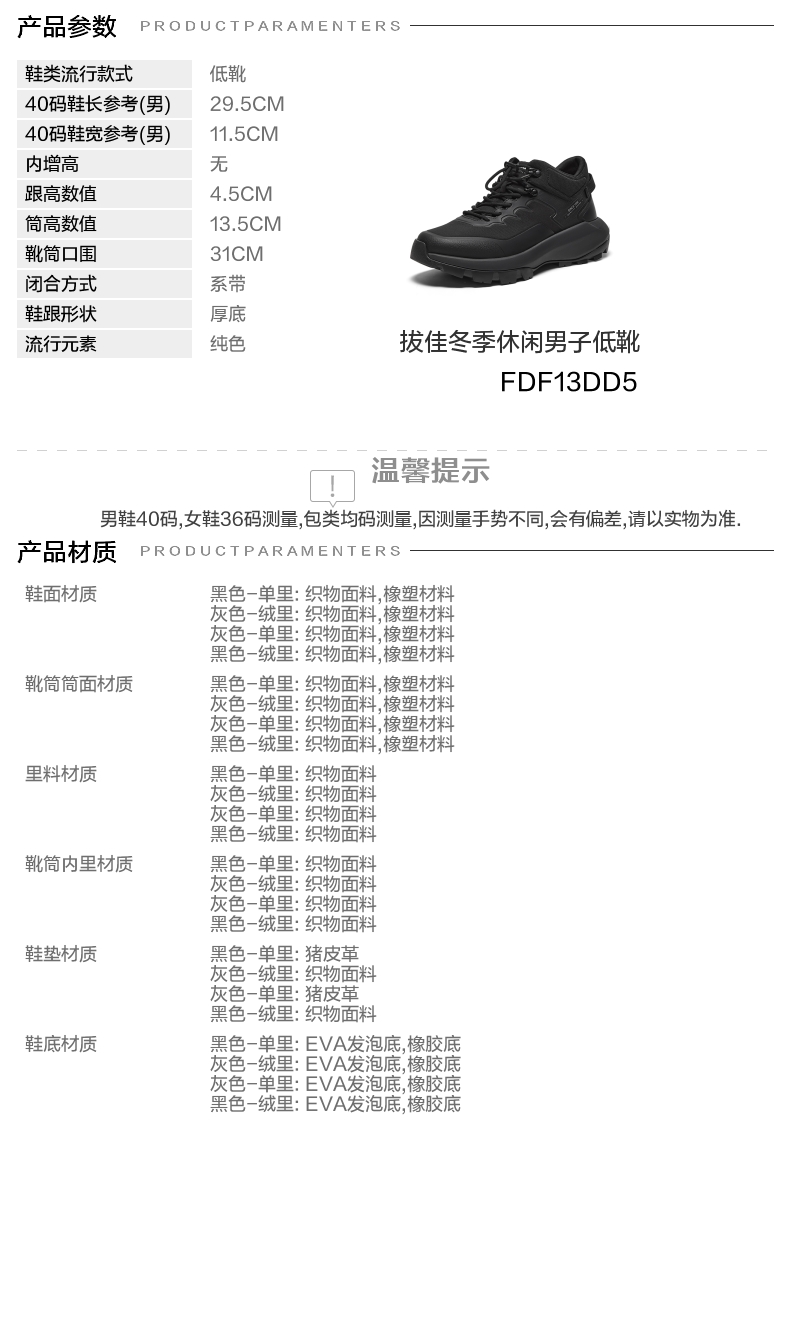 | 闭合方式:系带 | 40码鞋宽参考(男):11.5CM | 靴筒口围:31CM | 上市时间:2025年冬季 | 鞋类流行款式:低靴 |