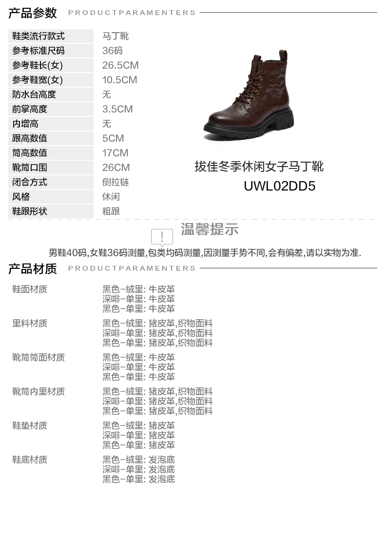 | 参考鞋宽(女):10.5CM | 风格:休闲 | 色系:咖啡色 | 跟高数值:5CM | 筒高数值:17CM |