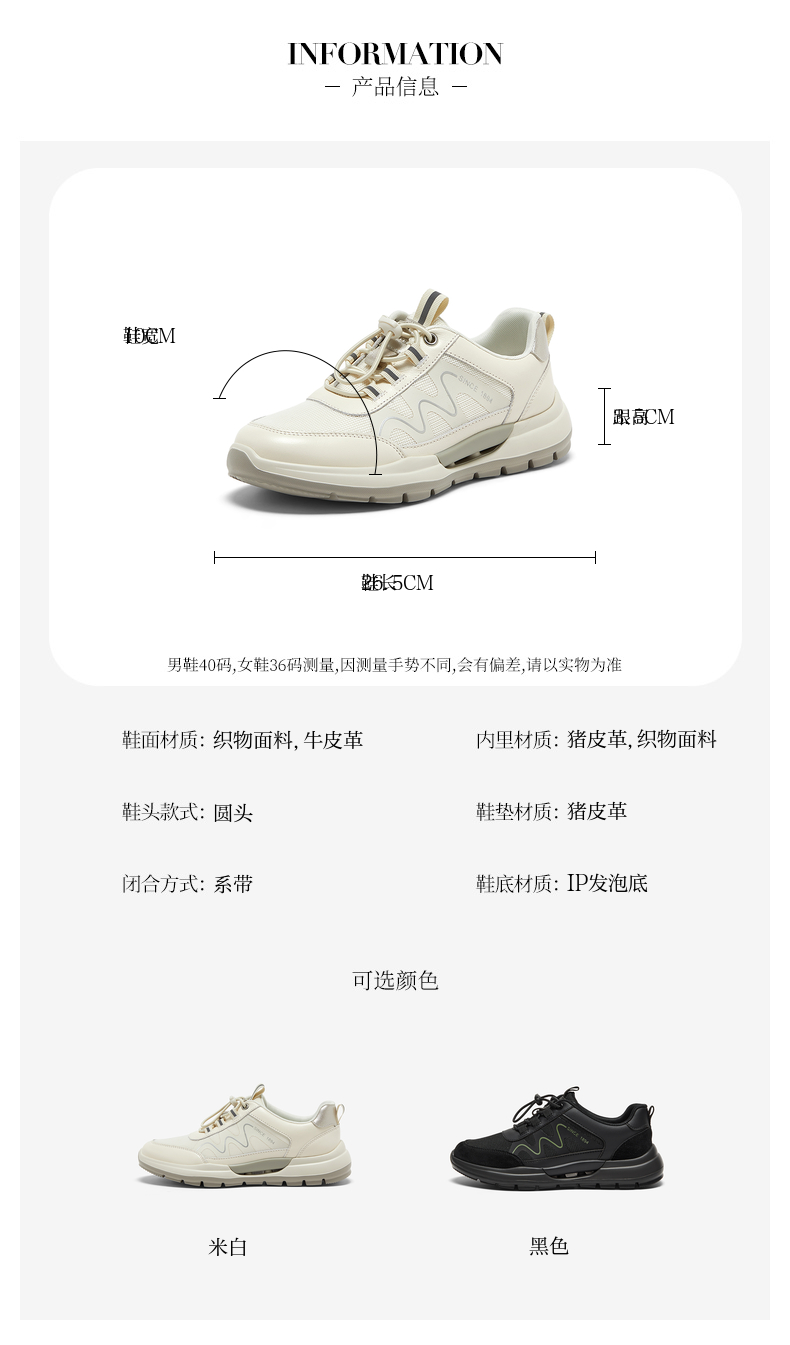 | 鞋帮:低帮 | 鞋底材质:IP发泡底 | 内增高:无 | 鞋面材质:牛皮革织物面料 | 闭合方式:系带 |