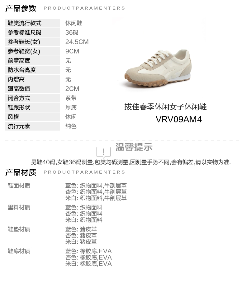 | 参考鞋长(女):24.5CM | 参考鞋宽(女):9CM | 风格:休闲 | 色系:米色 | 参考标准尺码:36码 |