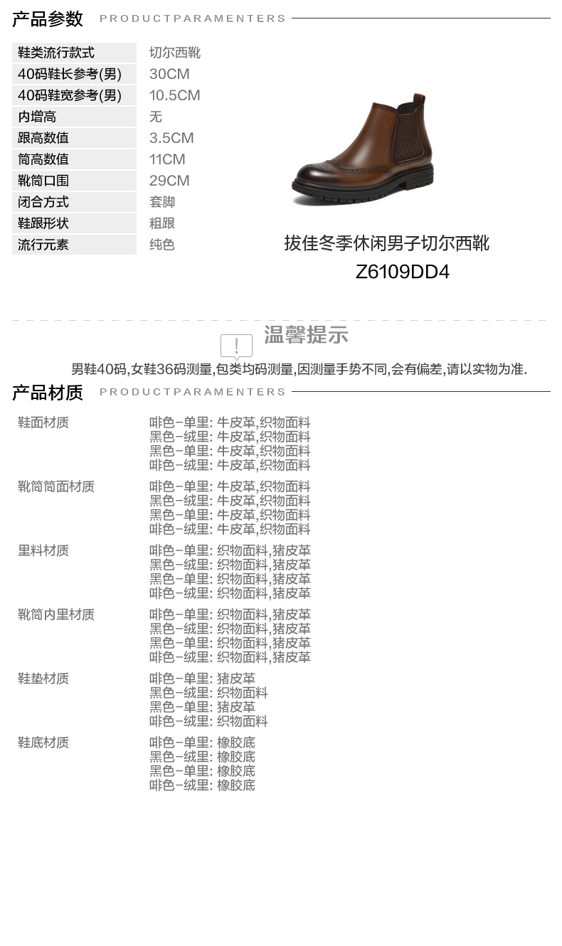 | 闭合方式:套脚 | 40码鞋宽参考(男):10.5CM | 靴筒口围:29CM | 上市时间:2024年冬季 | 鞋类流行款式:切尔西靴 |
