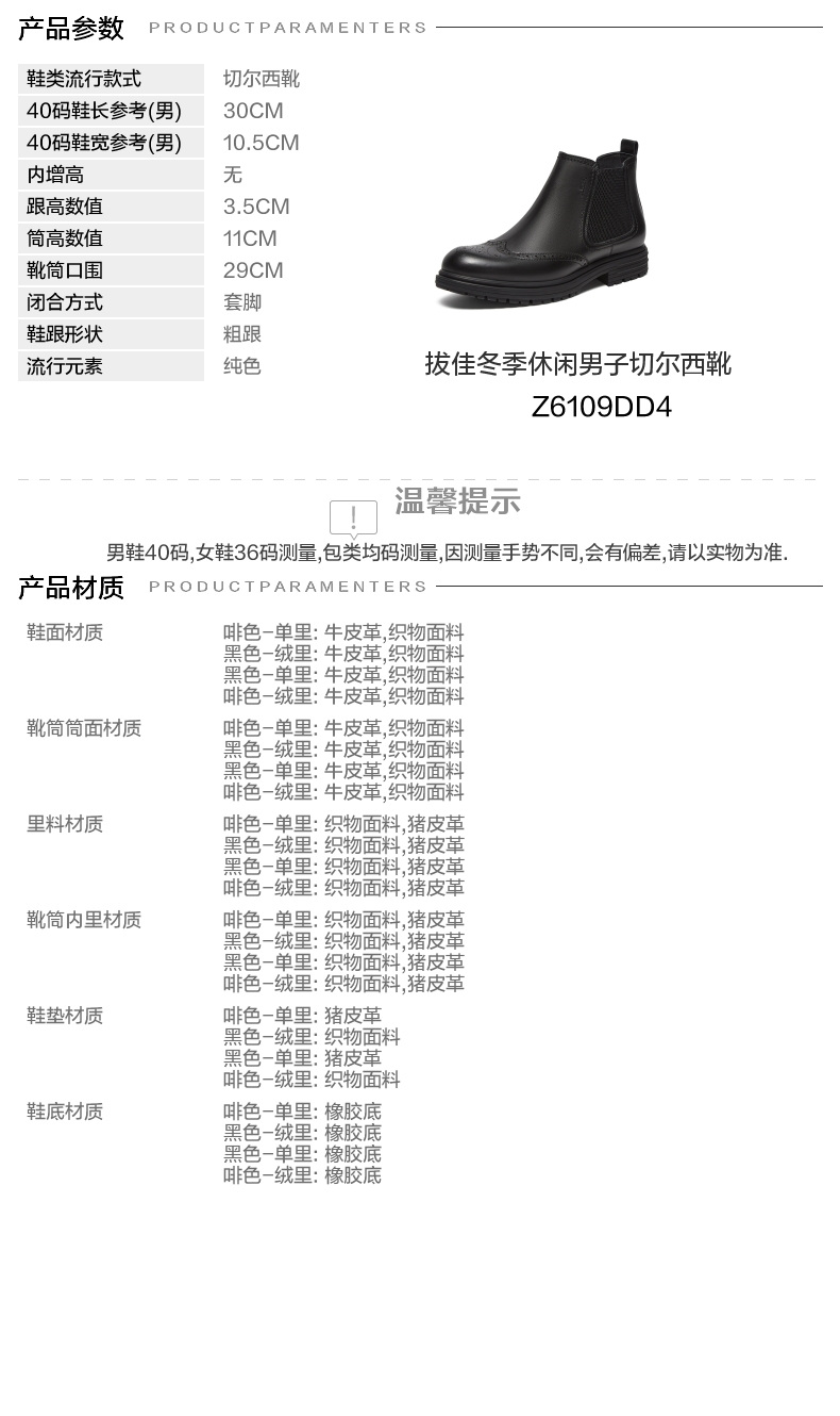 | 闭合方式:套脚 | 40码鞋宽参考(男):10.5CM | 靴筒口围:29CM | 上市时间:2024年冬季 | 鞋类流行款式:切尔西靴 |