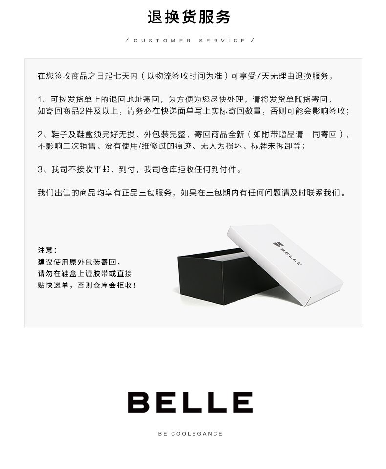BeLLE(百丽),百变所以美丽。主张多变多元的新生代态度,不断融合潮流趋势,拥抱不同的生活体验与生活经历。将女性的百变魅力注入到鞋履设计中,让女人在不同的人生阶段,不同的场合,不同的潮流趋势下,尽显自己自信的一面。致力于为现代都市女性提供充满自由的行走体验。