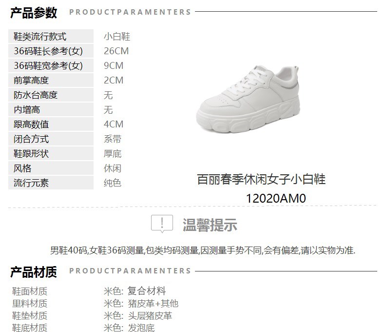 | 皮质特征:软面皮 | 前掌高度:2CM | 防水台高度:无 | 鞋类流行款式:小白鞋 |