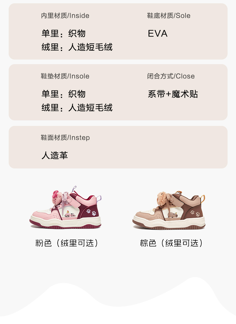 | 色系:棕色 | 适用场景:休闲 | 适用人群:儿童 | 性别:女童 | 里料材质:人造毛绒 |
