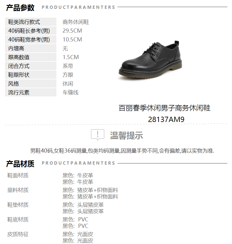 | 色系:黑色 | 跟高数值:1.5CM | 货品来源:外购 | 40码鞋宽参考(男):10.5CM | 性别:男子 |