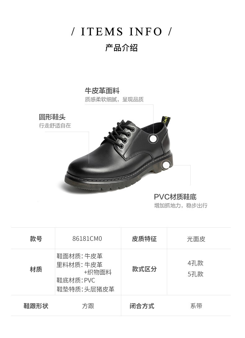 | 里料材质:猪皮革织物面料 | 制鞋工艺:胶贴皮鞋 | 款式季节:春季 | 鞋垫材质:头层猪皮革 | 皮质特征:光面皮 |
