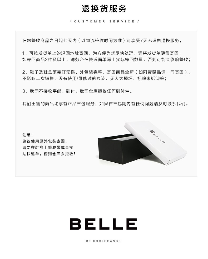 BeLLE(百丽),百变所以美丽。主张多变多元的新生代态度,不断融合潮流趋势,拥抱不同的生活体验与生活经历。将女性的百变魅力注入到鞋履设计中,让女人在不同的人生阶段,不同的场合,不同的潮流趋势下,尽显自己自信的一面。致力于为现代都市女性提供充满自由的行走体验。