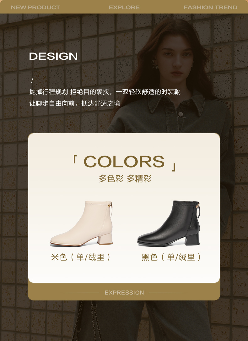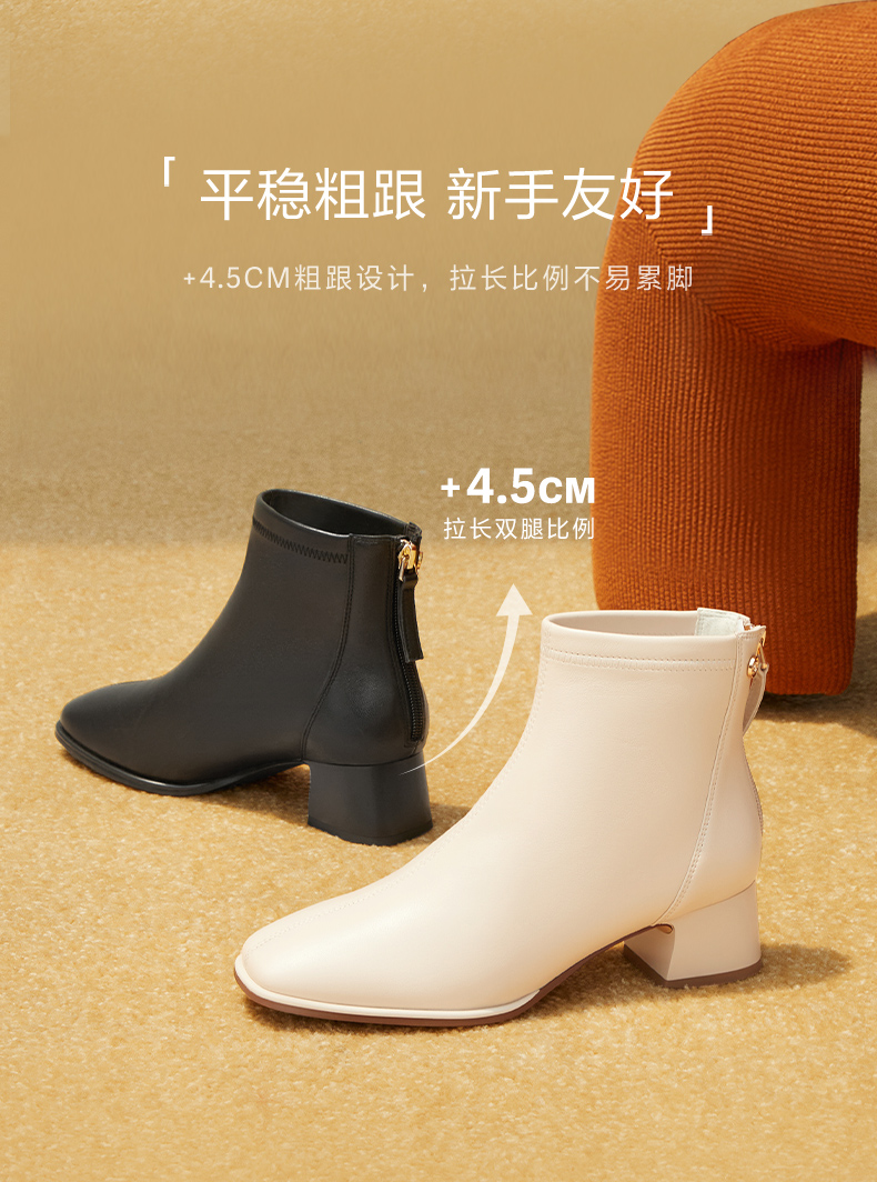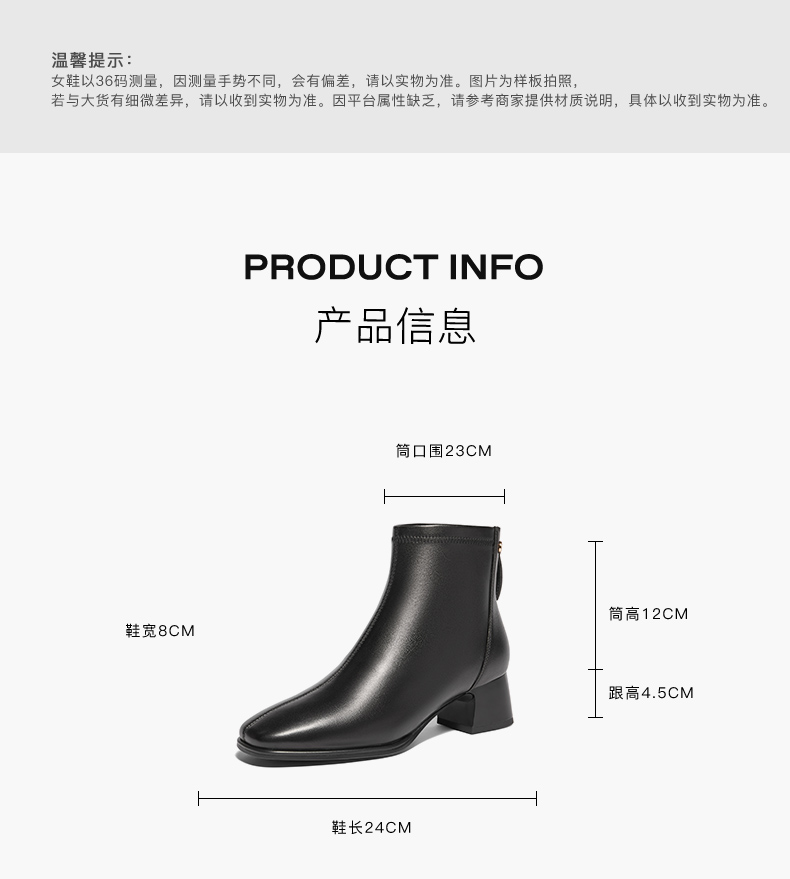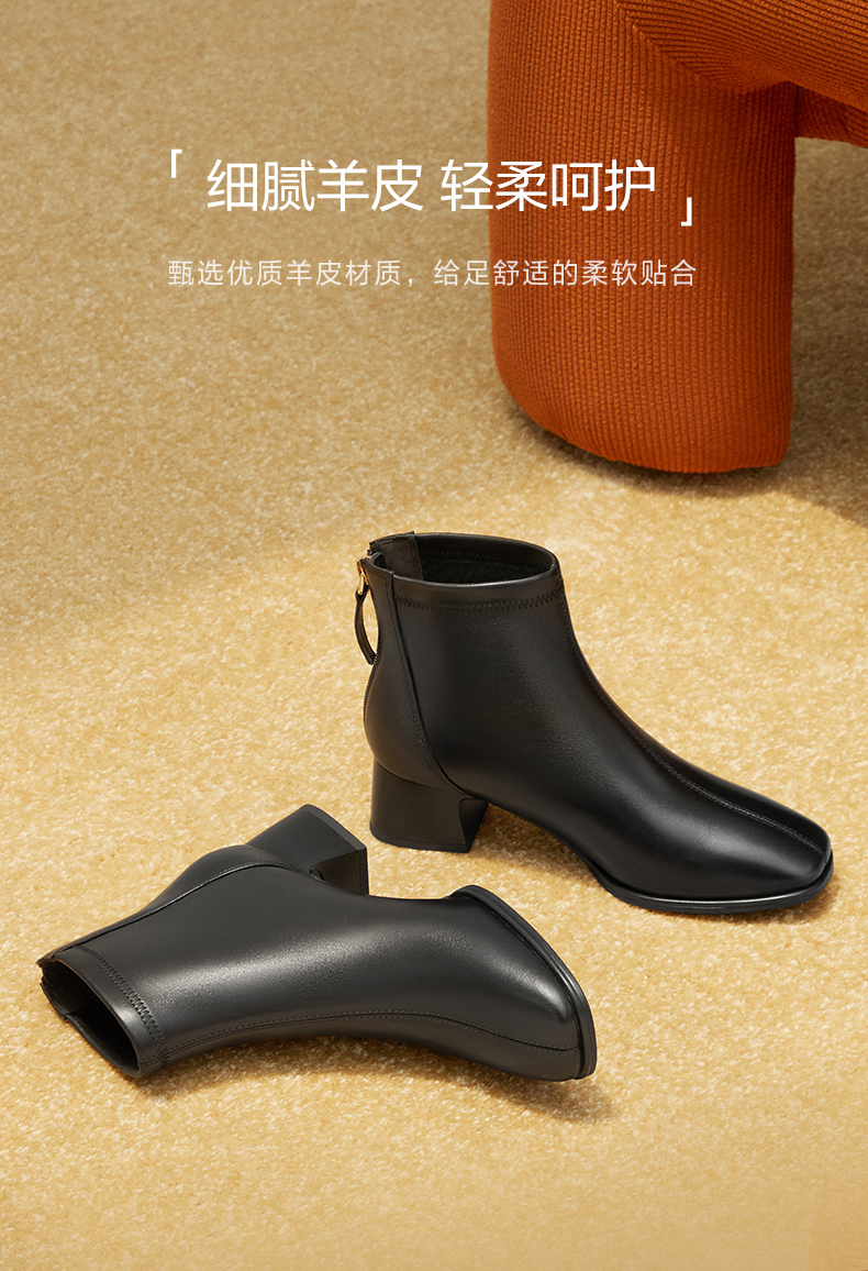 | 鞋底材质:橡胶底 | 靴筒内里材质:超纤织物猪皮革 | 内增高:无 | 鞋面材质:羊皮革 | 闭合方式:后拉链 |