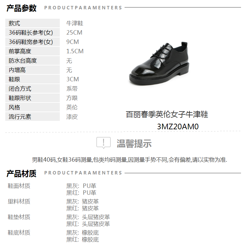 | 皮质特征:PU | 前掌高度:1.5CM | 防水台高度:无 | 鞋类流行款式:牛津鞋 |