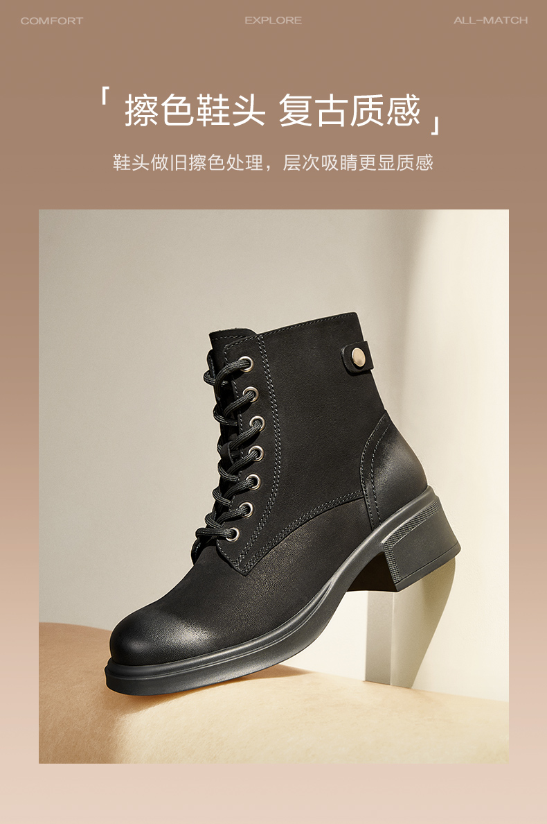 | 鞋底材质:橡胶底 | 靴筒内里材质:织物人造革 | 内增高:无 | 鞋面材质:羊皮革 | 闭合方式:系带 |