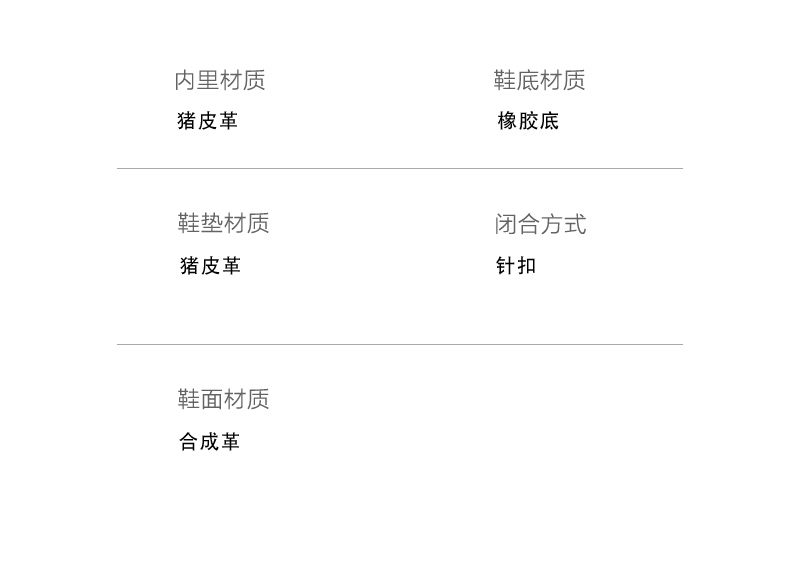 | 功能科技:耐磨 | 鞋底材质:橡胶底 | 内增高:无 | 鞋面材质:合成革 | 适用场合:办公室 |