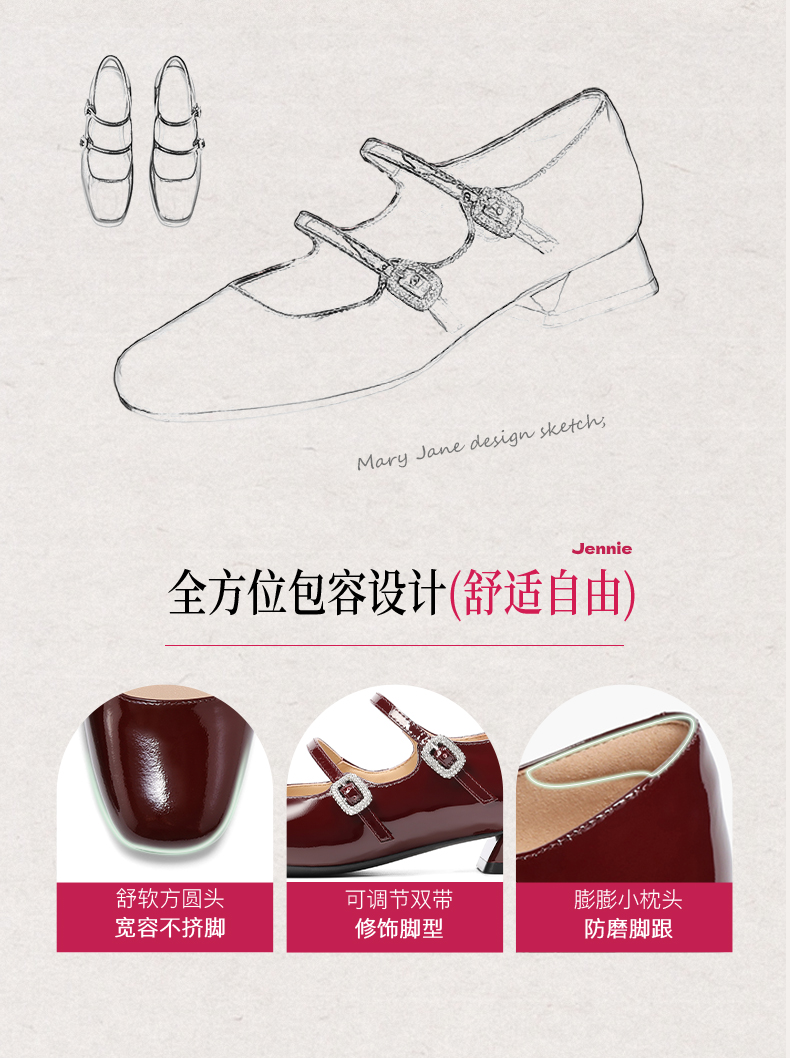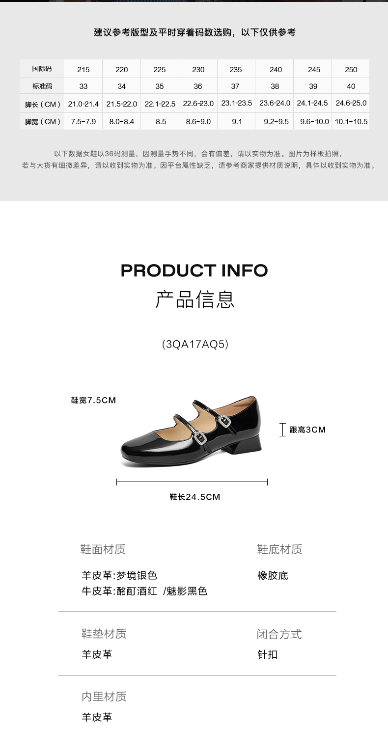 | 上市时间:2025年春季 | 生产/经销/进口厂家:百丽电子商务(上海)有限公司 | 鞋类流行款式:玛丽珍鞋 | 鞋头款式:方头 | 执行标准:皮鞋 QB/T1002-2015若与实物发生差异,请以实物标签为准 |