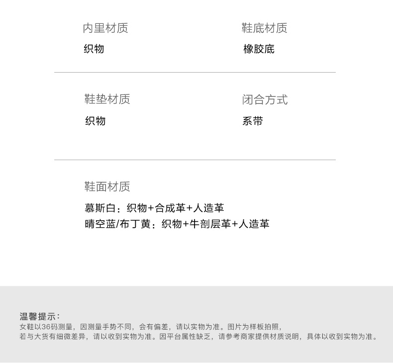 | 鞋帮:低帮 | 功能科技:无 | 鞋底材质:橡胶底 | 内增高:无 | 鞋面材质:织物面料人造革牛剖层革 |