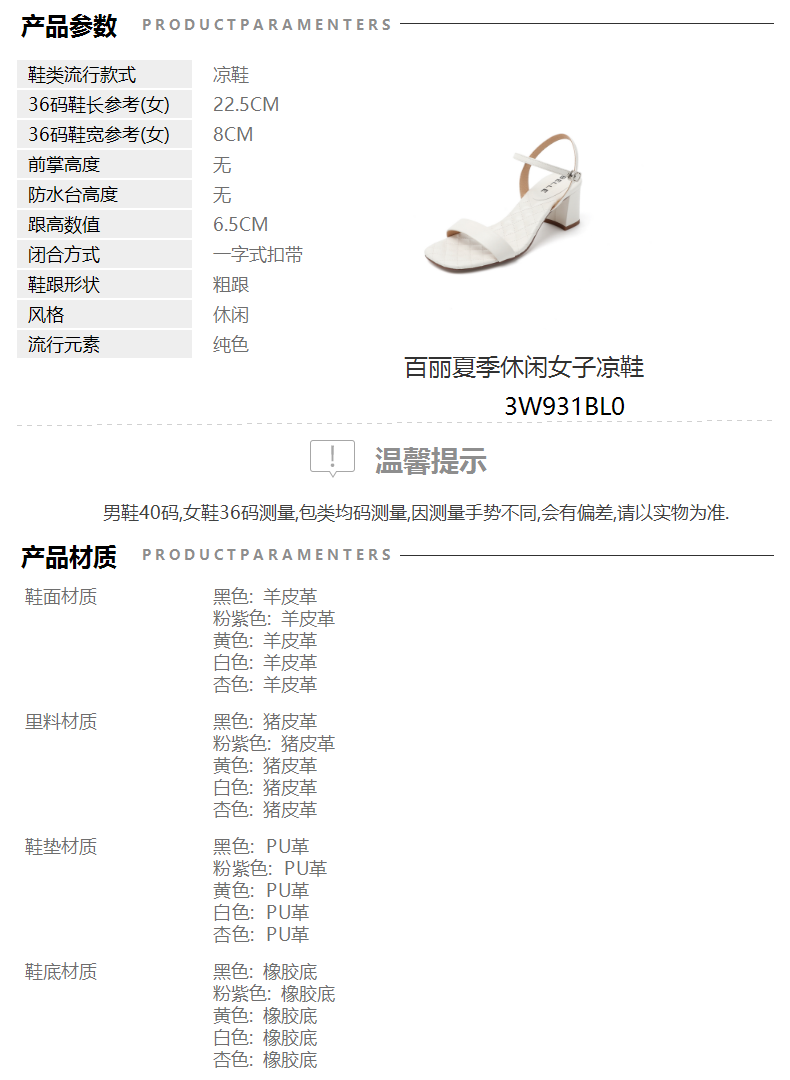 | 里料材质:猪皮革 | 制鞋工艺:皮凉鞋 | 款式季节:夏季 | 鞋垫材质:PU革 | 皮质特征:软面皮 |