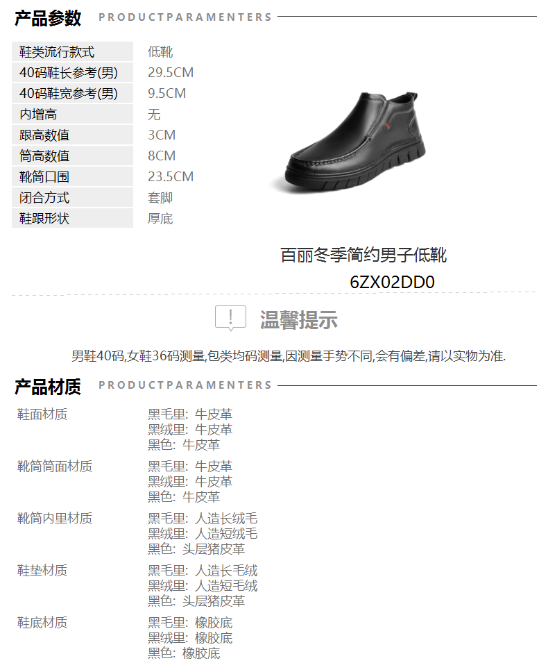 | 风格:简约 | 色系:黑色 | 跟高数值:3CM | 货品来源:外购 | 40码鞋宽参考(男):9.5CM |
