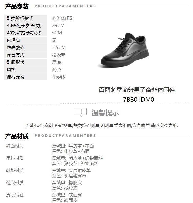 | 色系:黑色 | 跟高数值:3.5CM | 货品来源:外购 | 40码鞋宽参考(男):9CM | 性别:男子 |