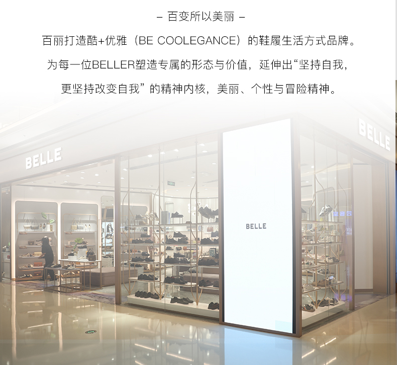 BeLLE(百丽),百变所以美丽。主张多变多元的新生代态度,不断融合潮流趋势,拥抱不同的生活体验与生活经历。将女性的百变魅力注入到鞋履设计中,让女人在不同的人生阶段,不同的场合,不同的潮流趋势下,尽显自己自信的一面。致力于为现代都市女性提供充满自由的行走体验。