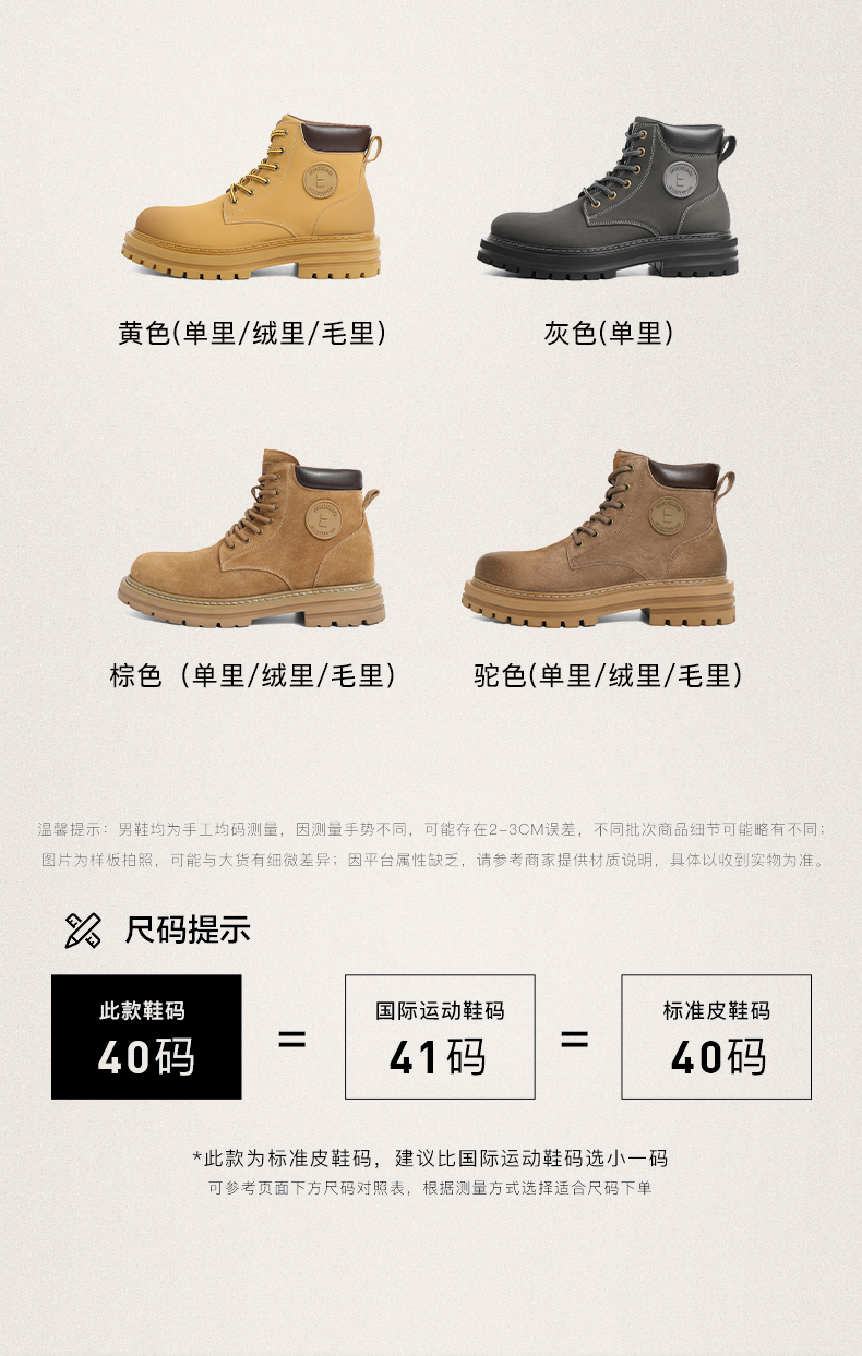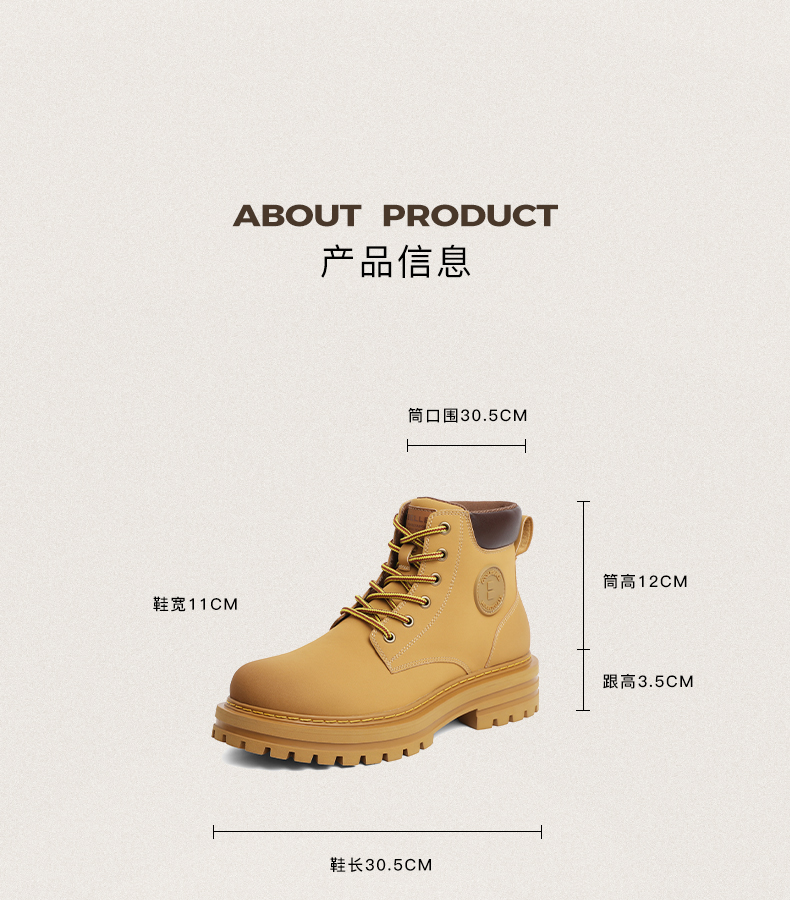| 闭合方式:系带 | 40码鞋宽参考(男):11CM | 靴筒口围:30.5CM | 上市时间:2023年冬季 | 鞋类流行款式:工装靴 |