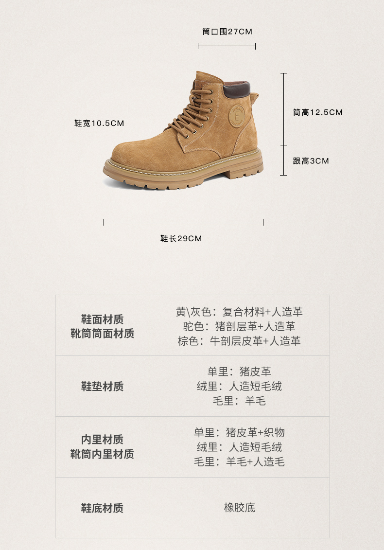 | 跟高数值:3.5CM | 色系:驼色 | 性别:男子 | 筒高数值:12CM | 靴筒筒面材质:人造革猪剖层皮革 |