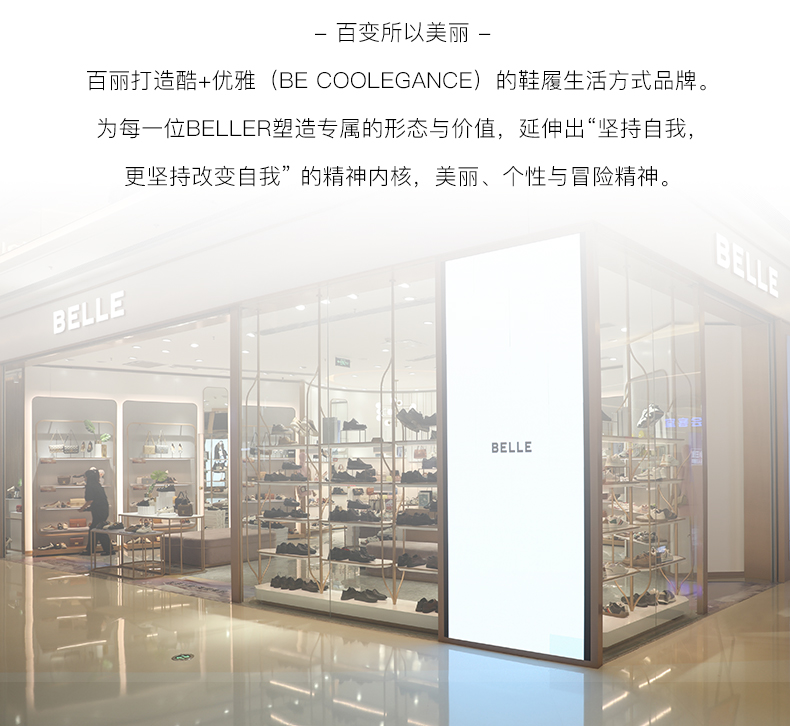 BeLLE(百丽),百变所以美丽。主张多变多元的新生代态度,不断融合潮流趋势,拥抱不同的生活体验与生活经历。将女性的百变魅力注入到鞋履设计中,让女人在不同的人生阶段,不同的场合,不同的潮流趋势下,尽显自己自信的一面。致力于为现代都市女性提供充满自由的行走体验。