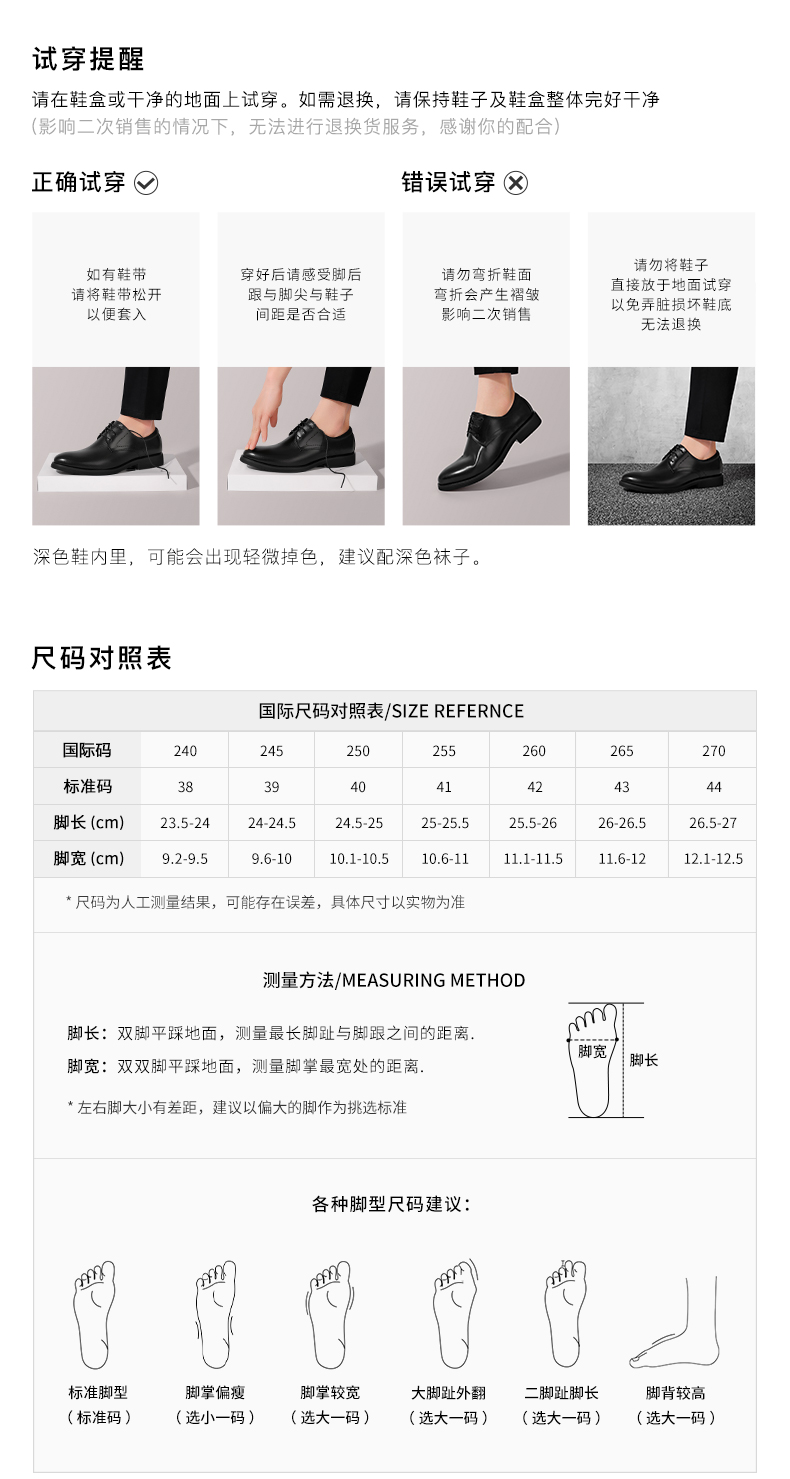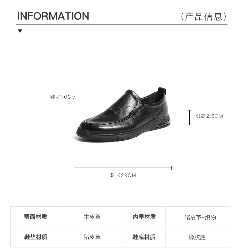 | 风格:商务休闲 | 色系:黑色 | 跟高数值:3CM | 40码鞋宽参考(男):10CM | 性别:男子 |