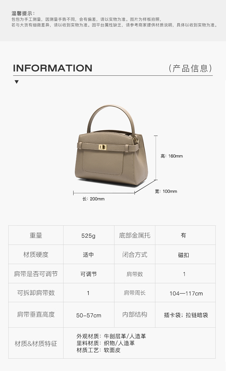 | 款式季节:春季 | 材质工艺:软面皮 | 皮质特征:软面皮 | 箱包硬度:半定型 | 箱包外观材质:人造革牛剖层皮革 |