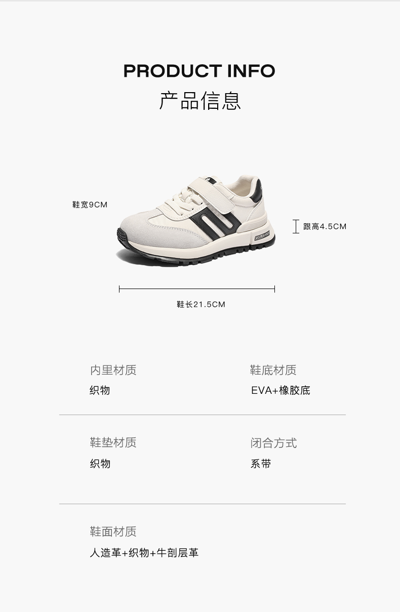 | 执行标准:儿童旅游鞋 QB/T 4331-2021若与实物发生差异,请以实物标签为准 | 鞋面图案:拼色 | 流行元素:拼色 | 年龄段:中童6~12岁 | 鞋码/内长:33码/21.5cm |